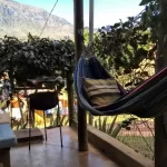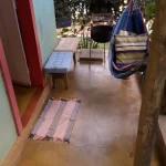 A Casinha Verde possui entrada independente pela lateral dessa casa, essa entrada tem uma pequena varanda coberta. Possui suporte para rede (01 pessoa), banco de madeira de 03 lugares e churrasqueirinha portátil.