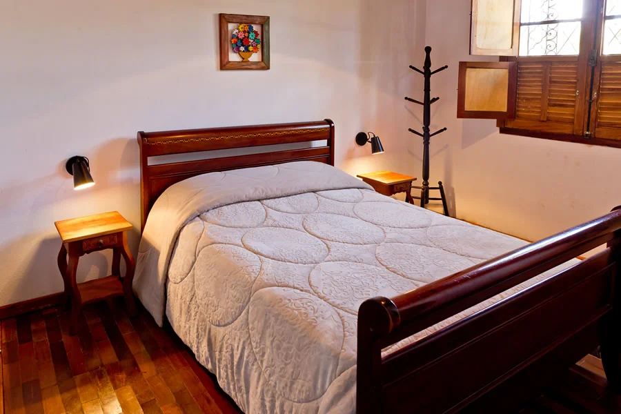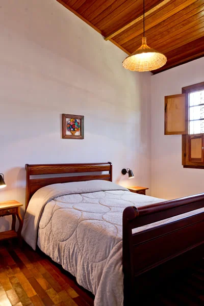 Oferecemos 3 chalés, com configurações variadas (casal, solteiros, triplo, casal com filhos). Temos também uma CASA de 2 QUARTOS, com 2 suítes, que pode receber até 5 pessoas, sendo uma suíte com cama de casal e a outra suíte com camas casal e solteiro.