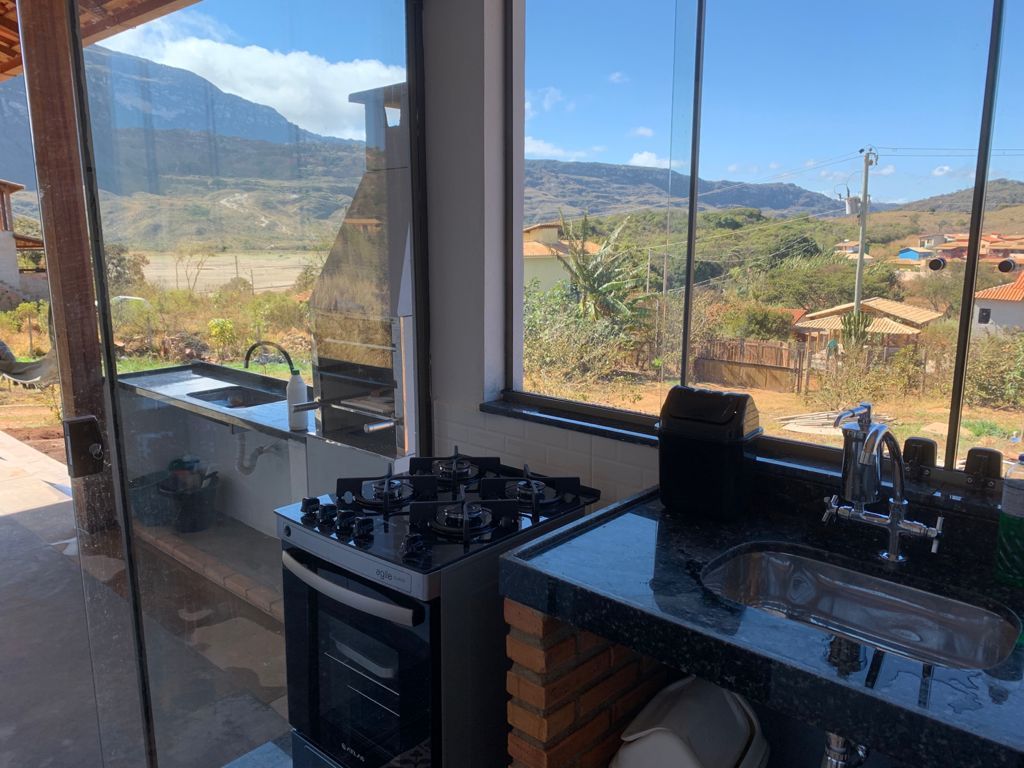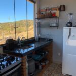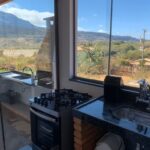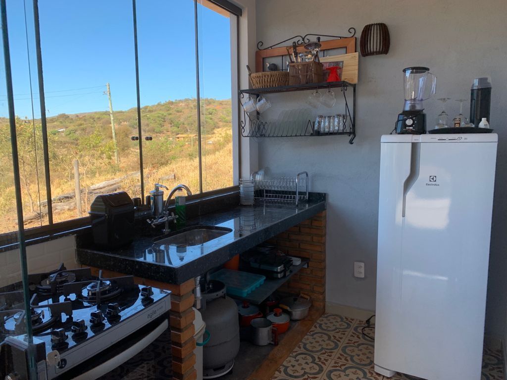 O ambiente integrado com antesala cria uma atmosfera acolhedora, enquanto a cozinha completa oferece toda a comodidade necessária para preparar refeições durante a estadia na Lapinha da Serra.