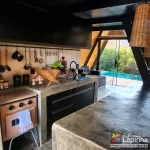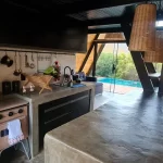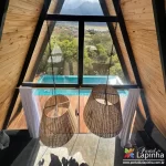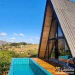 Possui uma sala com TV, internet wifi, conjugada com uma cozinha tipo americana toda completa com fogão, geladeira e todos os utensílios, um quarto suíte com uma cama de casal no banheiro uma ducha com aquecedor a gás e vista para o jardim de inverno com o teto panorâmica de vidro, um mezanino com uma cama de casal, um banheiro social para dar suporte ao mezanino e uma varanda de deck ao lado de um laguinho com cascata e uma maravilhosa vista para o paredão do pico do Breu.