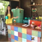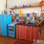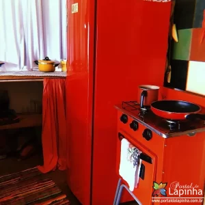 Cozinha tipo americana completa com geladeira, fogão e todos os utensílios domésticos;